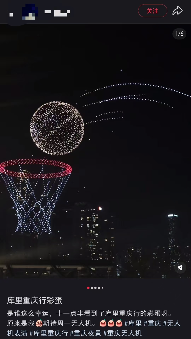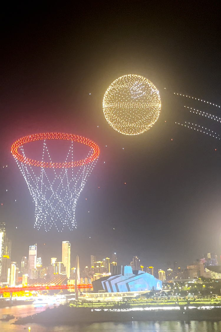近日,不少网友都拍到了新奇的一幕:“新韵重庆”无人机灯光秀预演中,一颗无人机组成的“篮球”飞进无人机组成的“篮筐”的壮观画面。作为无人机灯光秀的重要创作团队之一,四川美术学院设计创作团队参加了本次“新韵重庆”无人机灯光秀的创作。相关创作人员告诉上游新闻记者,这个“光影篮球”的创意来源于库里的招牌远投动作。届时,重庆大剧院外墙会播放库里职业生涯的高光时刻视频,最后的视频画面有一个他远投三分的动作,然后就衔接到无人机构成的一个“篮球”进入“篮筐”。