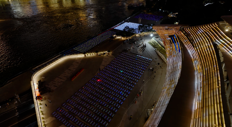 深圳大漠大智控技术有限公司(以下简称:大漠大公司)的无人机团队是“新韵重庆”无人机灯光秀的核心团队,该公司艺术设计部负责该项目的组长赵静告诉上游新闻记者,库里的三分球投篮本来就是篮球世界里极具艺术感和统治力的标志性符号。“我们这次希望突破一些常规的观看体验,用无人机为库里时刻赋予一个全新的维度,让投篮不再局限于球场,而是成为一个连接现实和虚拟、跨越空间的视觉奇观。刚好重庆大剧院幕墙的一个空间潜力可以让库里的投篮飞出屏幕,接着让无人机模拟篮球的飞行轨迹,实现一场打破物理边界的创意表演。”