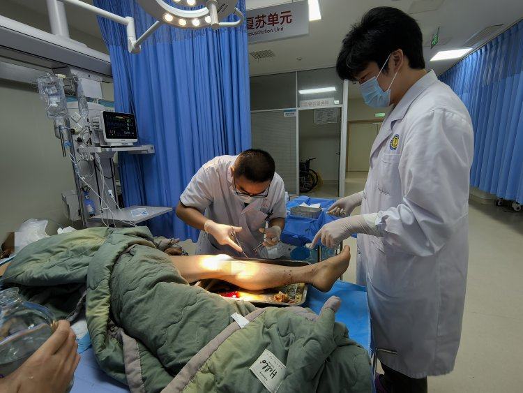 医生正在为患者进行腿部缝合