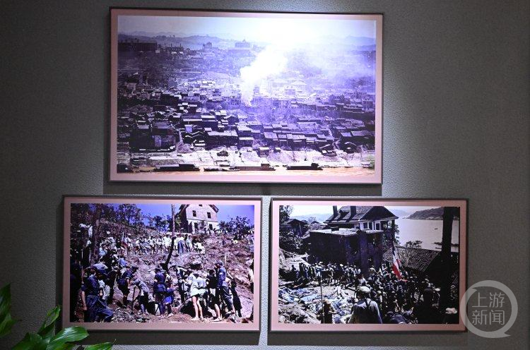 蓝色的粗布衣服堆成了小山,不远处的山坡上便是经历轰炸后四散零落的木屋柱头;隔着浑黄色的江水,吊脚楼仿佛看不到边,轰炸引发的大火、浓烟直窜天空……
