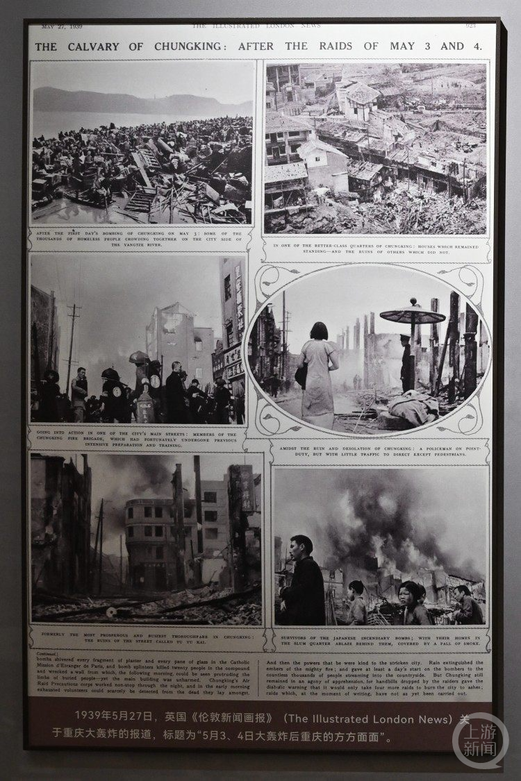 在丁英顺的指引下,记者看到,比如1939年5月27日的《伦敦新闻画报》就用了一个整版、6幅大图的篇幅对重庆大轰炸作了报道。标题为“5月3、4日大轰炸后重庆的方方面面”,所选图片中满眼都是断壁残垣、浓烟滚滚和大量无家可归的人。