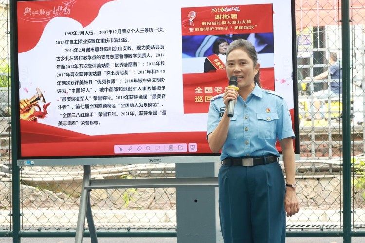 为进一步深化红色教育,五年级级部特邀“最美退役军人”谢彬蓉女士进校交流。谢彬蓉曾为空军某试验训练基地高级工程师,坚守内蒙古额济纳旗二十年,获个人三等功,还曾扎根四川凉山支教,荣获“中国好人”“全国助人为乐模范”等称号。