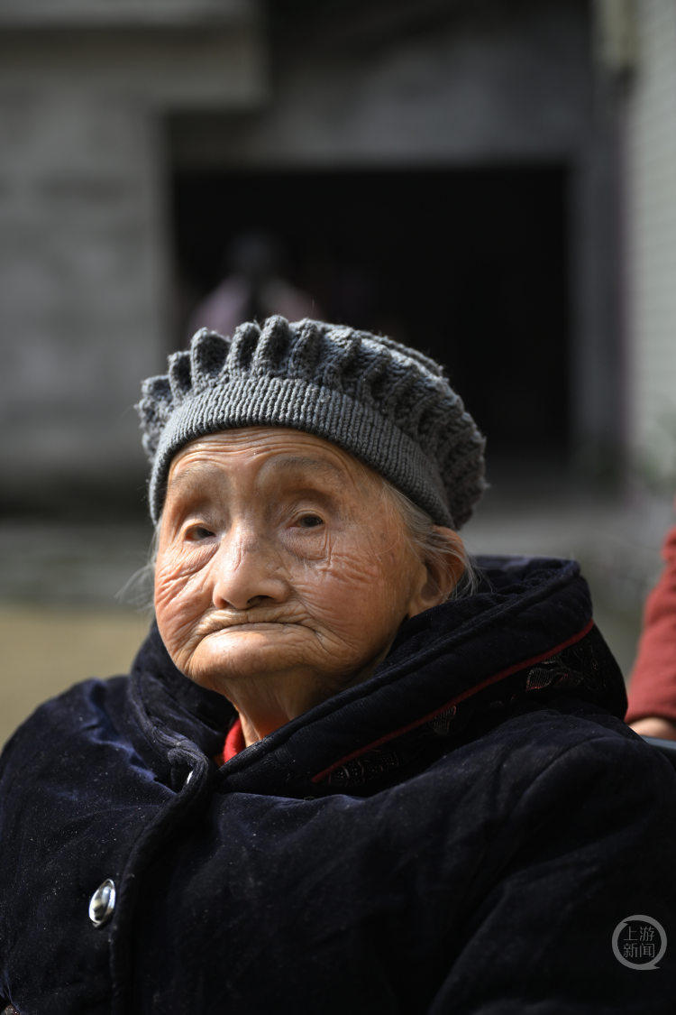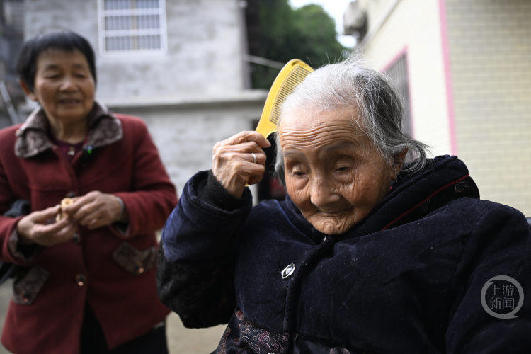 111岁的王素福坐在重庆江津一个农家小院里,望着田埂慢慢梳着头,然后把一顶毛线帽子缓缓戴在头上,享受难得的冬日暖阳。