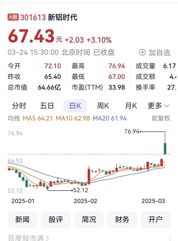 3月24日,汽车零部件渝企新铝时代(301613)公布重大资产重组预案复牌,报收67.43元,换手率27.24%,上涨3.1%。这家上市渝企主要生产汽车铝合金零部件,业务还拓展至消费电子领域。