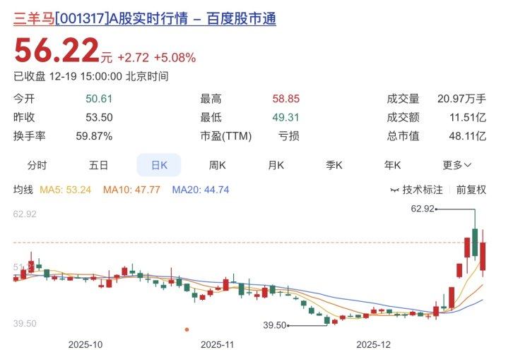 三羊马报收56.22元,日涨幅5.08%,换手率59.87%,周涨幅30.84%,列第一,今年以来涨幅103.18%。
