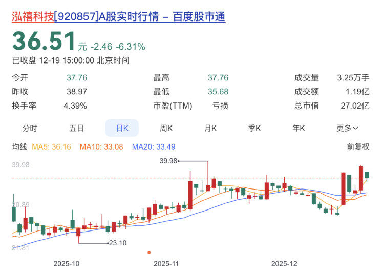 泓禧科技报收36.51元,日涨幅-6.31%,换手率4.39%,周涨幅26.03%,今年以来涨幅159.67%。