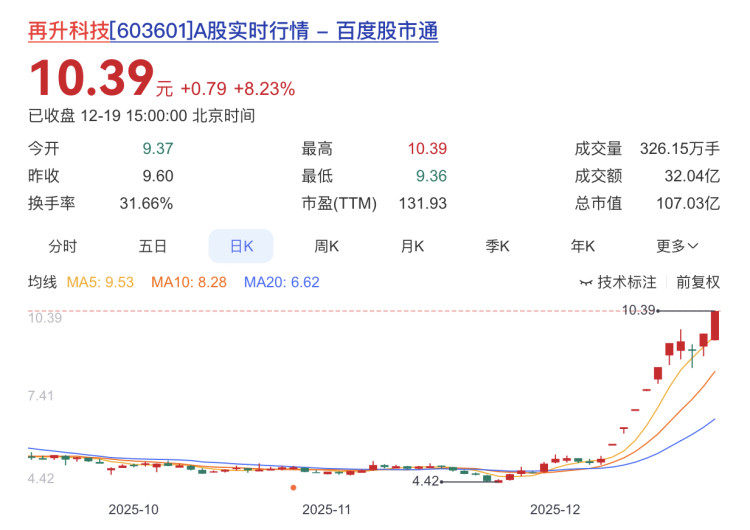再升科技报收10.39元,日涨幅8.23%,换手率31.66%,周涨幅23.25%,列第三,今年以来涨幅212.01%。