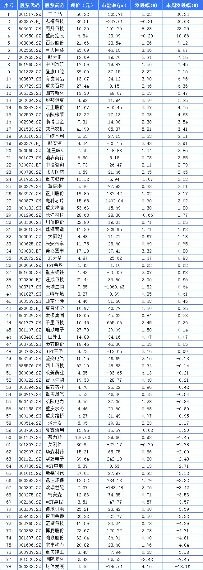 领涨的股票中,三羊马、泓禧科技和再升科技分别以涨幅30.84%、26.03%和23.25%,列重庆A股本周涨幅前三强。