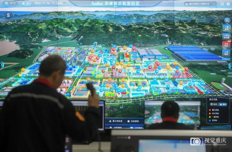 位于涪陵区的重庆华峰化工有限公司,华峰智慧安环一体化管控平台(华峰重庆智慧园区)用不同颜色显示着不同的重大危险源的风险等级。记者 张锦辉 摄/视觉重庆