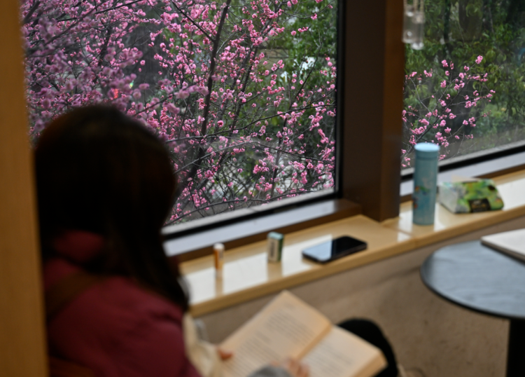 2月6日,重庆江北区图书馆鸿恩寺馆,市民在窗边阅读、学习,窗外的红梅竞相绽放。记者 刘力 摄/视觉重庆