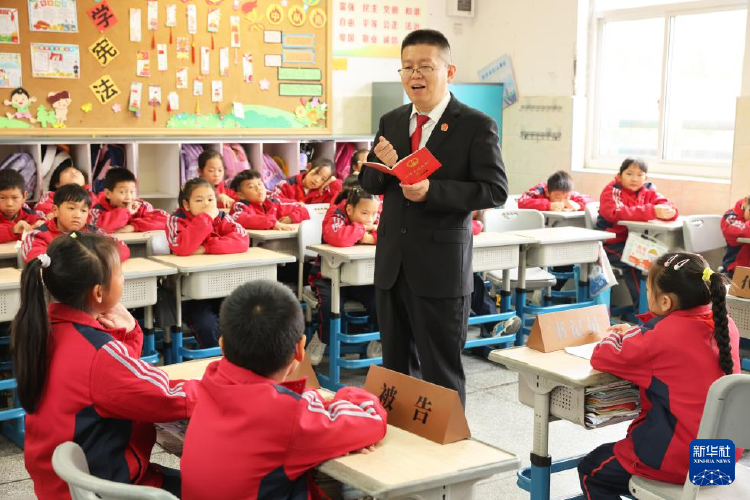 在浙江省湖州市德清县乾元镇中心小学的模拟法庭上,法官为学生们讲解宪法知识。倪立芳 摄/新华社