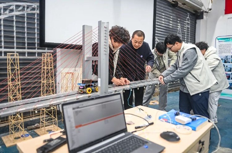 11月17日,重庆交通大学南岸校区,学生正在老师指导下进行桥梁传感器布设等操作。记者 郑宇 李志峰 摄/视觉重庆