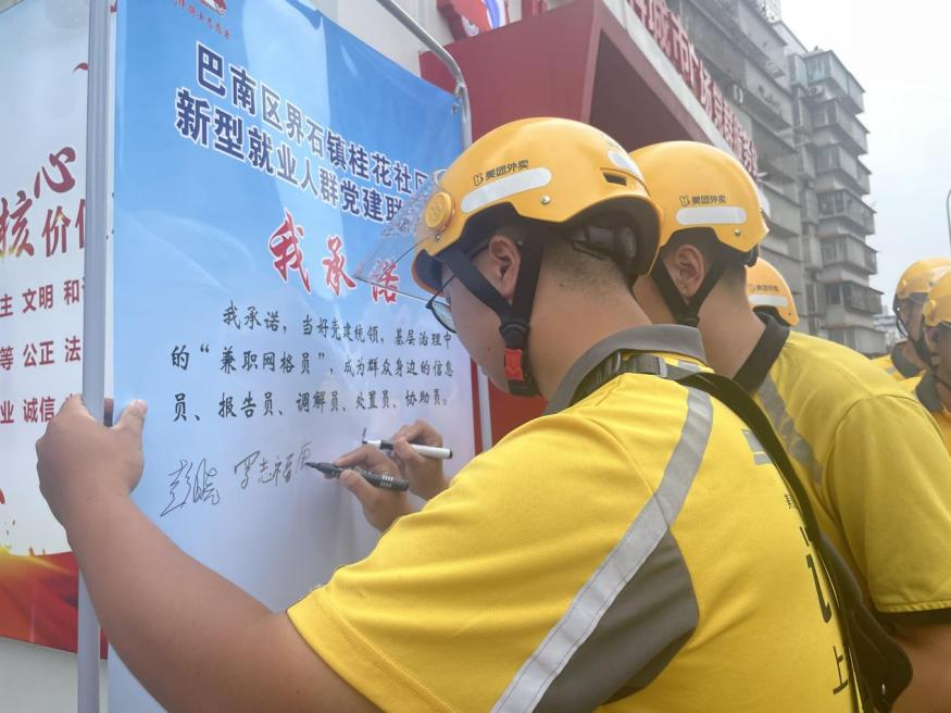 今年3月,巴南区界石镇桂花社区按照党建统领网格治理的要求,划分网格9个,配备“1+3+N”基层网格力量。为了加强“3”网格力量,社区充分发挥小哥驿站作用,持续推动新就业群体与网格化服务管理深度融合,为基层社会治理添力度、增温度。6月9日,界石镇桂花社区向外卖小哥颁发了兼职网格员聘书,27名外卖小哥在小哥驿站签署网格承诺书后正式加入社区“3”网格。