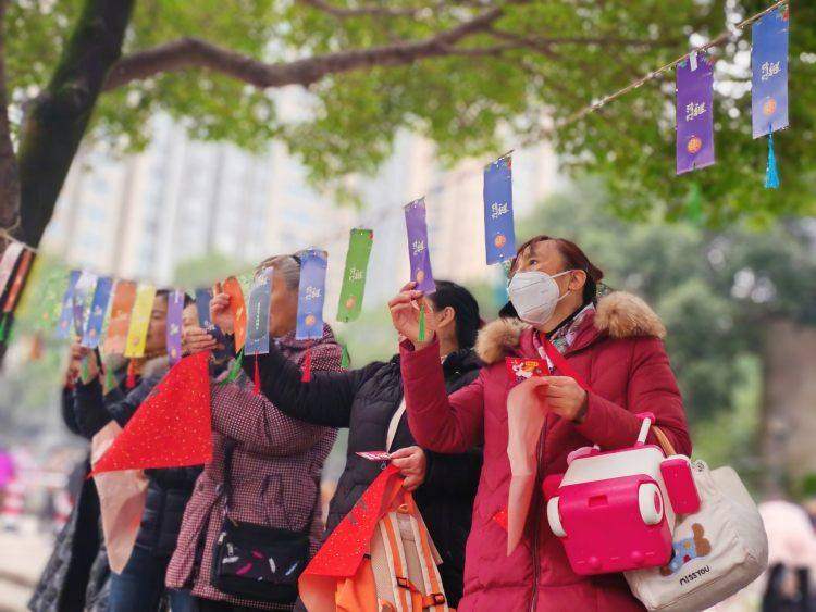社区设置兼具童趣与文化韵味的互动环节:“欢乐套圈”“抓福糖”迅速点燃参与热情,“猜灯谜”“书写福字”吸引居民沉浸体验,大家在破解灯谜、书写期许中感受节日氛围,现场欢声笑语不断。