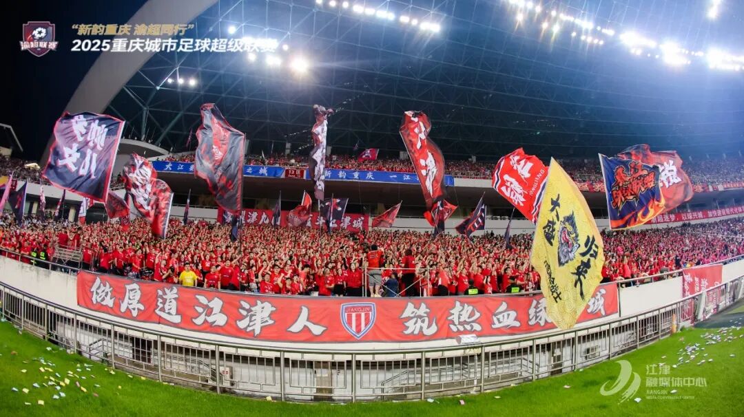 本土球迷组织“津九门”,以古江津城门为名,化身城市荣耀守护者,为江津队设计专属战旗,谱写铿锵战歌,《江津,你永远往前冲》以满腔热血点燃球队前进豪情。