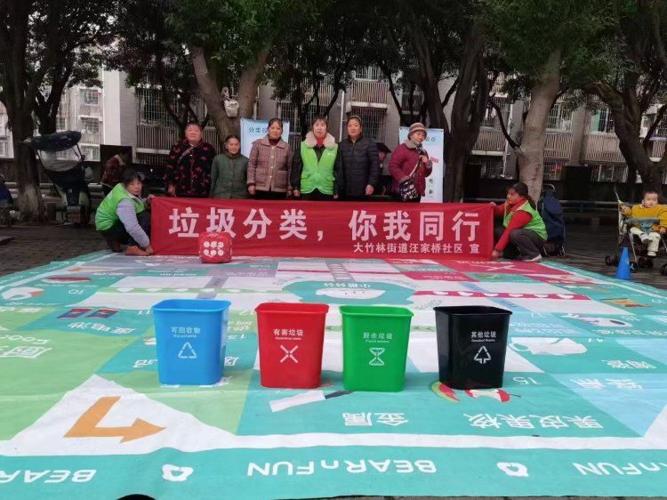 12月4日,重庆两江新区大竹林街道联合重庆左岸环境服务股份有限公司在水竹苑社区广场,开展“垃圾分类,你我同行”主题宣传活动,以巨型飞行棋游戏解锁分类知识,现场人气高涨、氛围热烈。