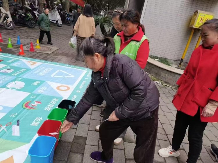 活动现场,印有“果皮果核”“油漆桶”等标识的巨型棋盘铺展地面,居民投掷巨型骰子前进,需根据格子提示将对应垃圾卡片精准投入可回收物、有害垃圾等分类桶。老人手举卡片仔细辨认,年轻居民凑在一起讨论规则,社区志愿者穿梭其间及时指导纠错。“玩家”与“裁判”身份交织,热烈的气氛中广场变成了“分类课堂”,温馨又鲜活。