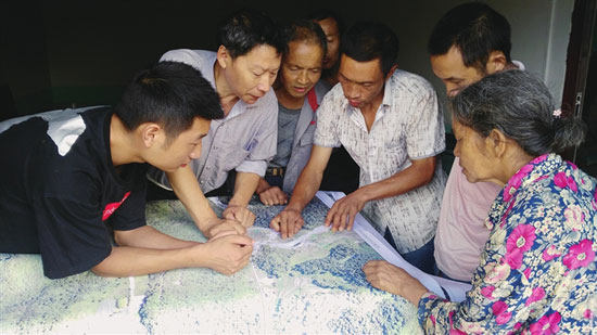 村民正在航拍地图上指界确认。(李洪生/摄)