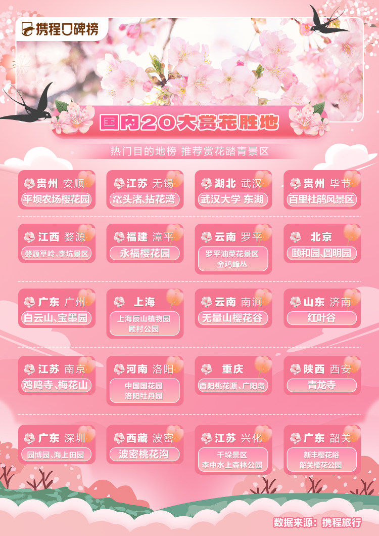 在这份“国内20大赏花胜地”榜单中,重庆和贵州安顺、江苏无锡、湖北武汉、贵州毕节、江西婺源、福建漳平、云南罗平、北京、广东广州、上海、云南南涧、山东济南、江苏南京、河南洛阳、陕西西安、广东深圳、西藏波密、江苏兴化、广东韶关一同上榜。