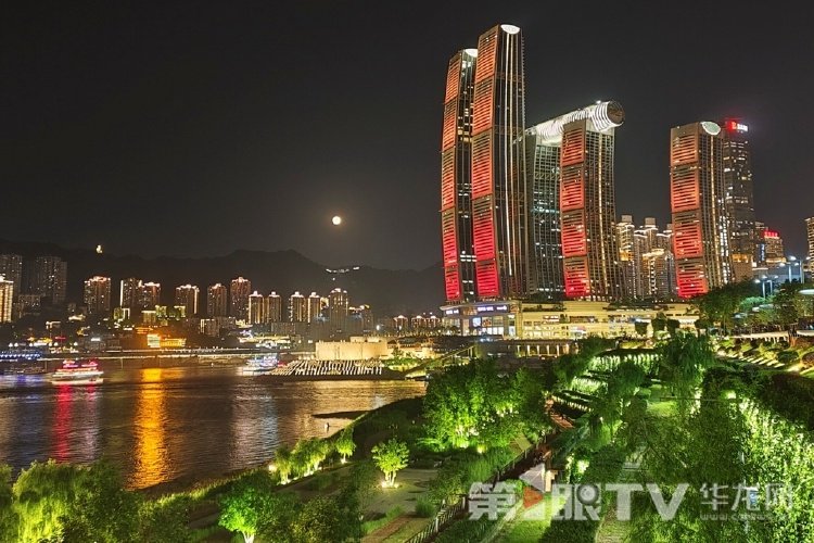 重庆江北嘴,月亮从南山上方升起。第1眼TV-华龙网记者 石涛 摄