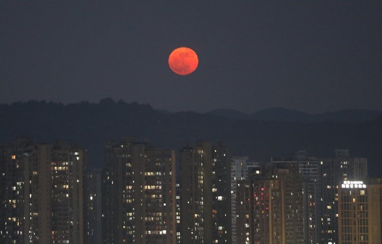 一轮红月悬于夜空。第1眼TV-华龙网记者 李一鸣 摄