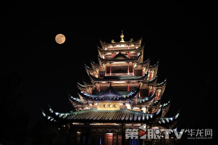明月与鸿恩阁同框。第1眼TV-华龙网记者 陈洋 摄
