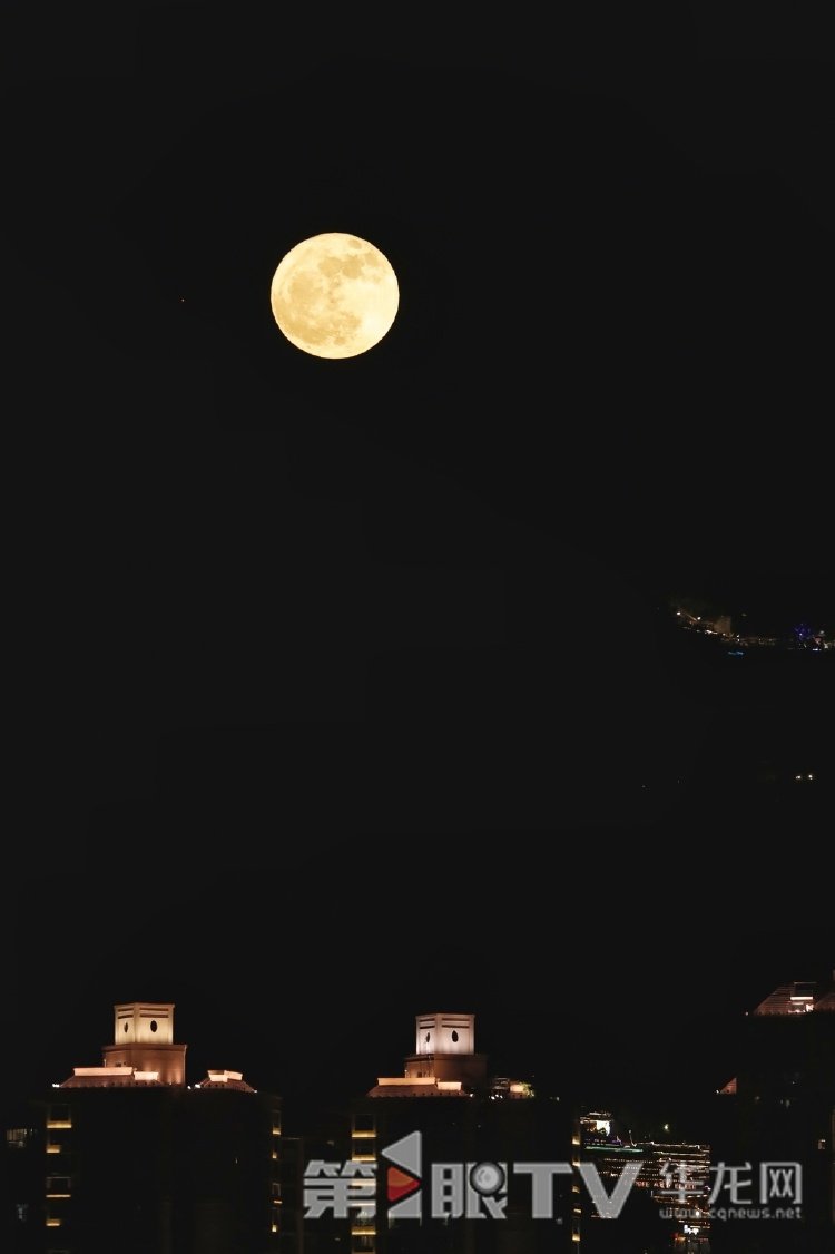 6月11日,北滨一路,一轮圆月挂在城市上空。通讯员李笑翔 摄