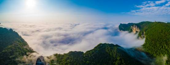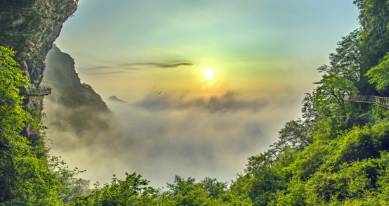 摩围山,这座常年被云雾笼罩的翡翠秘境,以云端仙境、森林氧吧的治愈力,邀你远离喧嚣。清晨时分,壮美的日出云海景观恰似人间仙境。从飞云口到豹头崖,清风徐徐,云雾缭绕,形成百里银色的海;初升太阳洒下缕缕金光,云朵瞬间变为金色;还有延绵的山峦被云海包围,恰似飞瀑在群山间流淌……飞云口作为最佳观赏位置,喜欢看云海美景的朋友不要错过哟!