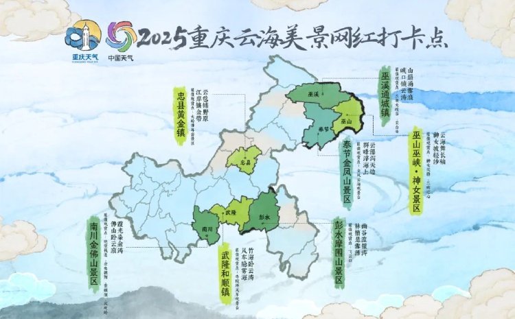 为了让市民和游客更方便地打卡,重庆天气联合中国天气特别制作2025重庆云海美景网红打卡点地图,告知你重庆哪些地方云海最漂亮,哪些位置能观赏到超赞云海美景。