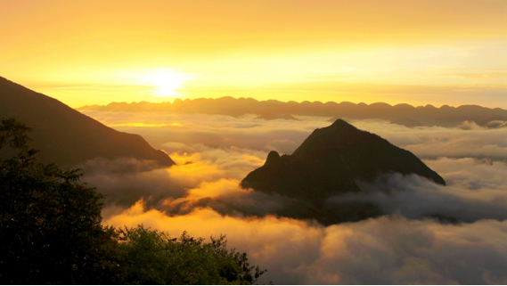 金凤山因山峰形似金凤而得名,其海拔1900多米,是天坑地缝景区的最高点,也是观赏云海和日出的绝佳位置。站在金凤云海观景台,可以俯瞰整个天坑地缝景区的喀斯特地貌。这里的云海层层叠叠,连绵起伏不定,仿佛纯白的棉絮紧紧环绕在山峰间。云海或浓郁,或浅淡,或热烈,或宁静,时而飘逸如轻纱,时而翻滚似波涛,变幻万千。