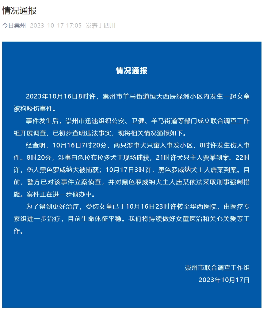 经查明,10月16日7时20分,两只涉事犬只窜入事发小区,8时许发生伤人事件。8时20分,涉事白色拉布拉多犬于现场捕获,21时许犬只主人贾某到案。22时许,伤人黑色罗威纳犬被捕获;10月17日3时许,黑色罗威纳犬主人唐某到案。目前,警方已对该事件立案侦查,并对黑色罗威纳犬主人唐某依法采取刑事强制措施。案件正在进一步侦办中。
