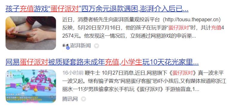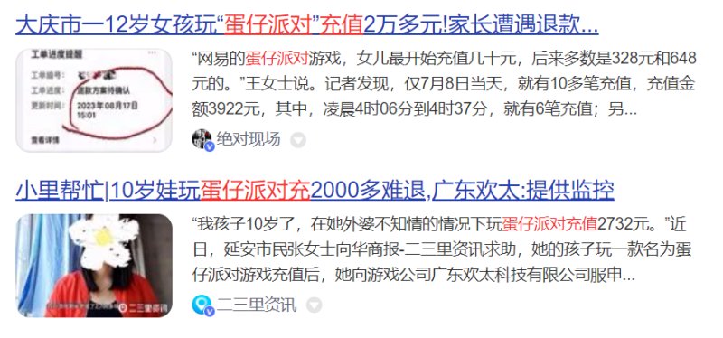 在网页中搜索蛋仔派对,就能搜到大量学生背着家长给游戏充值几千到十几万元不等,又遭遇退费难的新闻。