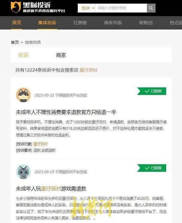 记者从黑猫投诉平台输入“《蛋仔派对》”关键词检索发现,共有1.2万余投诉,其中大多数与未成年人充值有关。其中,未成年人年龄大多在10岁左右,有的甚至只有6岁,达不到该游戏玩家至少年龄8岁+的要求。家长们普遍反映,孩子都是在绕过实名认证登录后被游戏诱导消费,且丝毫不限制充值金额,在退款时遭遇各种障碍,与《蛋仔派对》官方客服交涉时,对方往往把责任推给游戏合作平台,有的只能退一小部分,有的一分钱都不退。