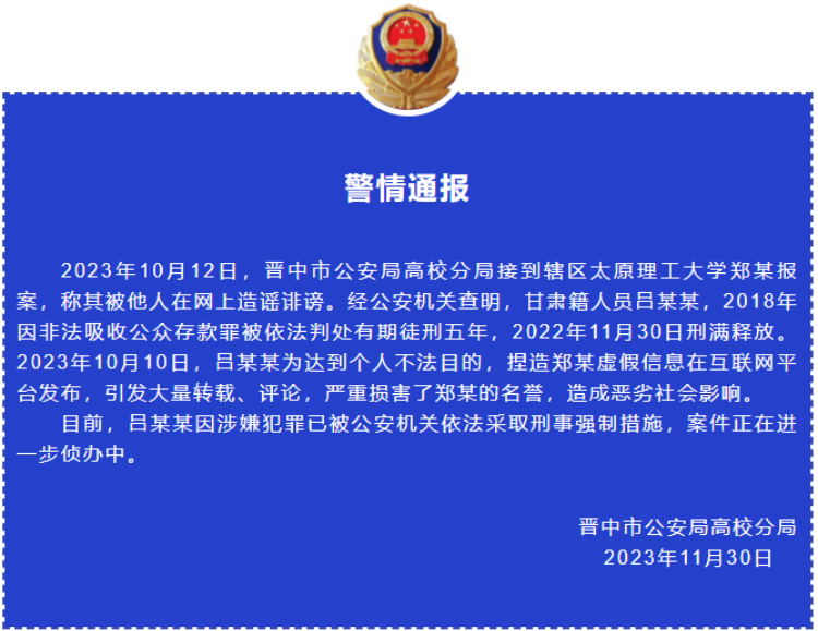 11月30日晚,晋中市公安局高校分局发布警情通报称,2023年10月12日,晋中市公安局高校分局接到辖区太原理工大学郑某报案,称其被他人在网上造谣诽谤。经公安机关查明,甘肃籍人员吕某某,2018年因非法吸收公众存款罪被依法判处有期徒刑五年,2022年11月30日刑满释放。2023年10月10日,吕某某为达到个人不法目的,捏造郑某虚假信息在互联网平台发布,引发大量转载、评论,严重损害了郑某的名誉,造成恶劣社会影响。