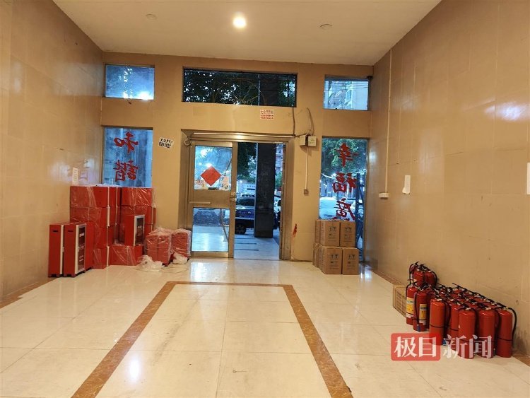 大堂内的地面上,则摆放了大量新购置的消防器材,包括灭火器箱、推车式灭火器等。记者在楼内多个楼层走访时,均有看到电梯间两边楼道摆放有灭火器箱。