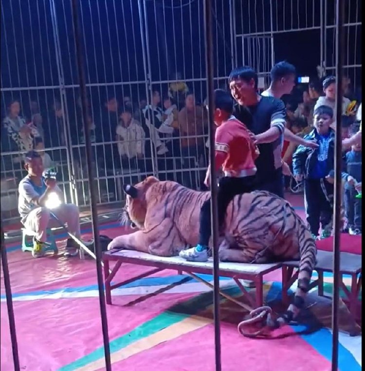 该网友发布的多个视频画面显示,马戏团表演地点在广西百色市田东县恒力广场。12月8日下午,田东县文旅局工作人员回应极目新闻(报料邮箱:jimu1701@163.com)记者称,这几天当地确实有马戏团表演并备案,时间到12月10日止。文旅局负责审批杂技项目的表演,小孩骑老虎不属于表演,该行为不在审批内容里。
