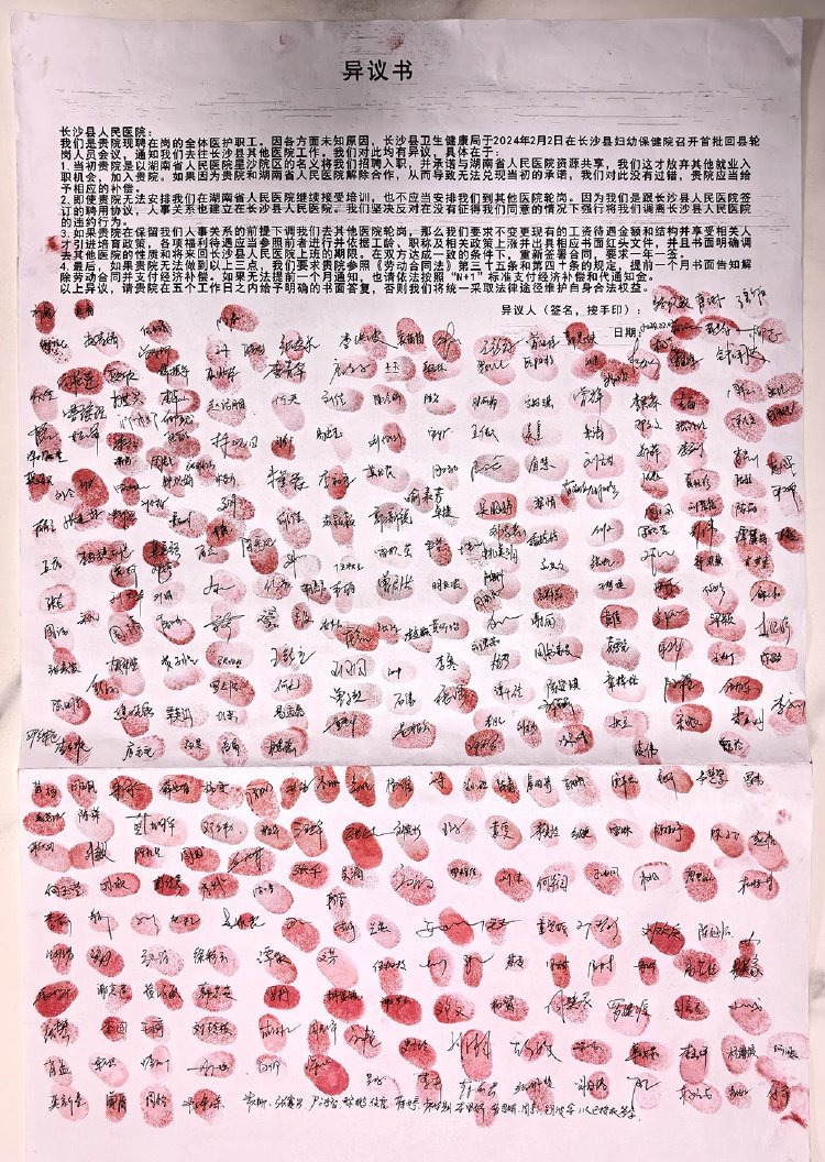 “轮岗”会议两天后,一份《异议书》被寄往长沙县人民医院和县卫健局。366名医务人员在这份《异议书》上签名、按手印,对轮岗安排、与湖南省人民医院解除合作等事项提出了异议。