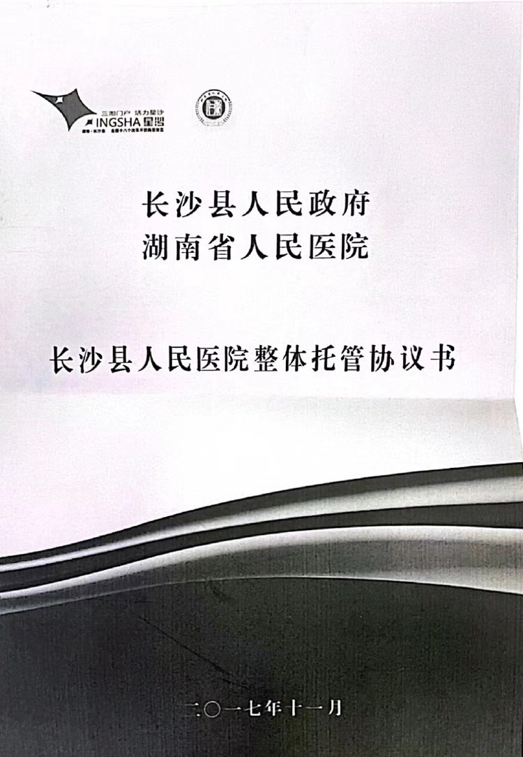 2017年,长沙县人民政府与湖南省人民医院签订协议,合作建设“全国一流的县级综合医院”。筹建的长沙县人民医院由长沙县方面投资,按管办分离、整体托管的模式,由湖南省人民医院进行整体管理,新建医院加挂“湖南省人民医院星沙院区”的牌子。