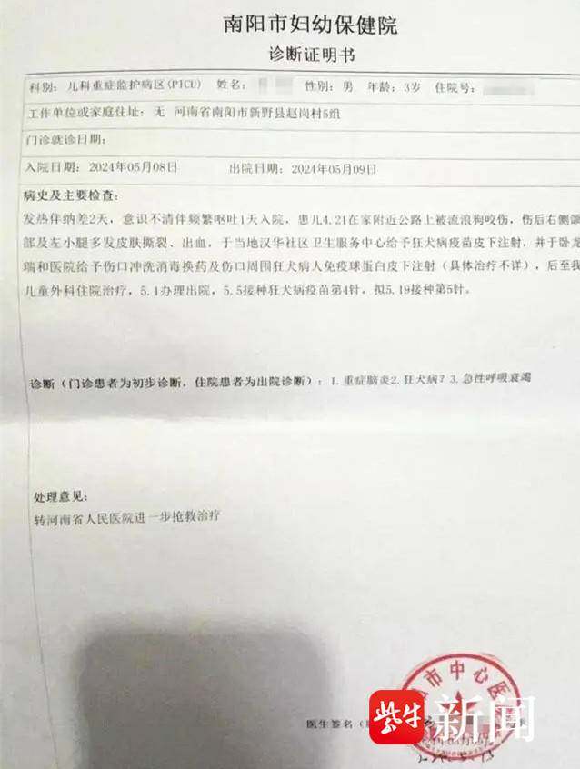 事发后,樊女士一家迅速将小星送往社区医院,紧急注射了狂犬病疫苗。随后,他们赶到南阳市清洗了伤口并注射了狂犬病免疫球蛋白,并在南阳市中心医院办理了住院,注射了破伤风疫苗,并对伤口进行了清创处理。小星在南阳市中心医院住院治疗了9天,于5月1日办理了出院。