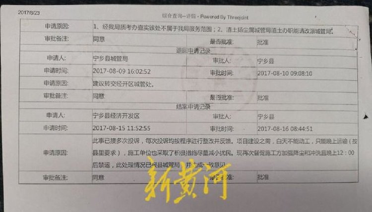 新黄河记者获取的一份受理于2017年8月8日的《长沙市12345市民服务热线工单》显示:“市民来电反映,城郊乡(现为城郊街道)石头坑村石山砖厂连续五六天很多运渣土车出入,导致有很多灰尘,请相关部门解决。”长沙市12345当月回复称,此事已接受多次投诉,每次投诉均按程序进行整改并反馈。项目建设之需,白天不能动工,只能晚上运输(按县里要求),施工单位也采取了积极措施尽量减少扰民。现再次督促施工方加强降尘和冲洗且晚上12点后禁运,此处理情况已报城管局,并达成一致意见。