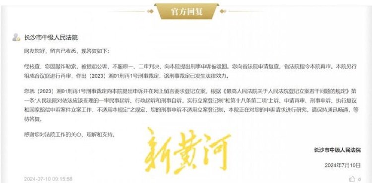 今年6月,周小兰在湖南省“百姓呼声”平台上投诉“长沙市中级人民法院对(2023)湘01刑再1号申诉案件有案不立”。7月10日,长沙市中级人民法院回应称,根据《最高人民法院关于人民法院登记立案若干问题的规定》第一条“人民法院对依法应该受理的一审民事起诉、行政起诉和刑事自诉,实行立案登记制”和第十八条第二项“上诉、申请再审、刑事申诉、执行复议和国家赔偿申诉案件立案工作,不适用本规定”之规定,该刑事申诉不适用立案登记制,本院正在对申诉请求进行研究,请保持通信畅通,等待答复。