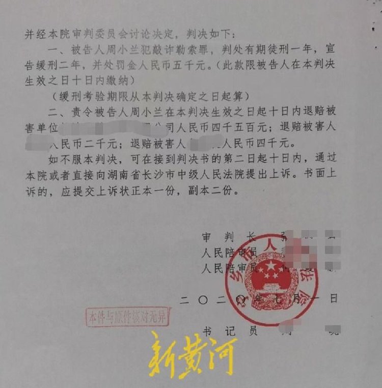 2020年7月,宁乡市人民法院对此案作出一审判决:周小兰以非法占有为目的,多次敲诈勒索他人财物,且数额较大,其行为构成敲诈勒索罪,判处周小兰有期徒刑一年、缓刑二年。