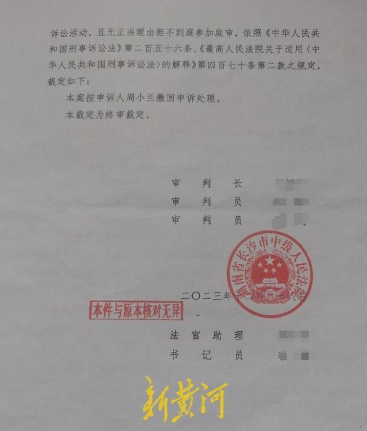 2023年12月28日,长沙市中级人民法院作出了“本案按周小兰撤回申诉处理”,理由是“申诉人周小兰经多次依法通知后拒不来本院参加诉讼活动,且无正当理由拒不参加本院庭审,后经多次依法通知仍不来本院参加诉讼活动”。