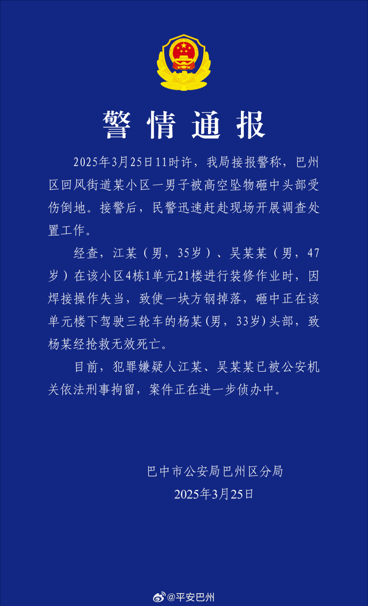 3月25日中午,四川省巴中市回风街道一小区发生高空坠物事件,致一名快递员死亡。25日晚间,上游新闻(报料邮箱:cnshangyou@163.com)记者从当地警方获悉,两名装修作业人员因操作失当,导致方钢掉落砸中快递员杨某致其死亡,目前两名装修人员已被刑拘。
