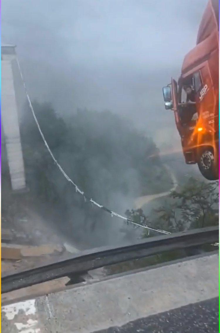 视频显示,一红色货车车头已经悬空,车身还留在路面,货车司机尚待在车头。拍摄者对司机喊“你命大啊,危险啊!只能等消防来啊!没信号!” 司机劝该路人不要再往前,该路人随即发现路面有开裂,迅速往后撤。