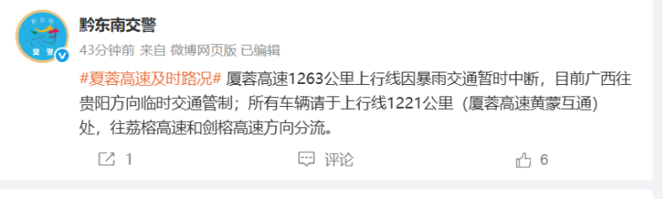 据黔东南交警消息,厦蓉高速1263公里上行线因暴雨交通暂时中断,目前广西往贵阳方向临时交通管制;所有车辆请于上行线1221公里(厦蓉高速黄蒙互通)处,往荔榕高速和剑榕高速方向分流。黔东南州交警支队工作人员称,事发路段并不在黔东南州辖区,“发布通报也是为了提醒广大车主。”