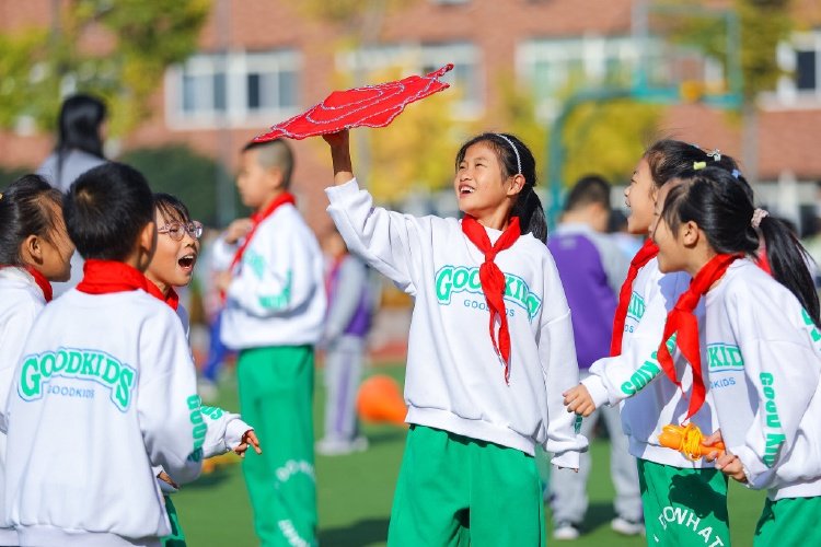 2024年10月29日,山东青岛,虎山路小学的学生在课间休息时转手绢。 视觉中国 图