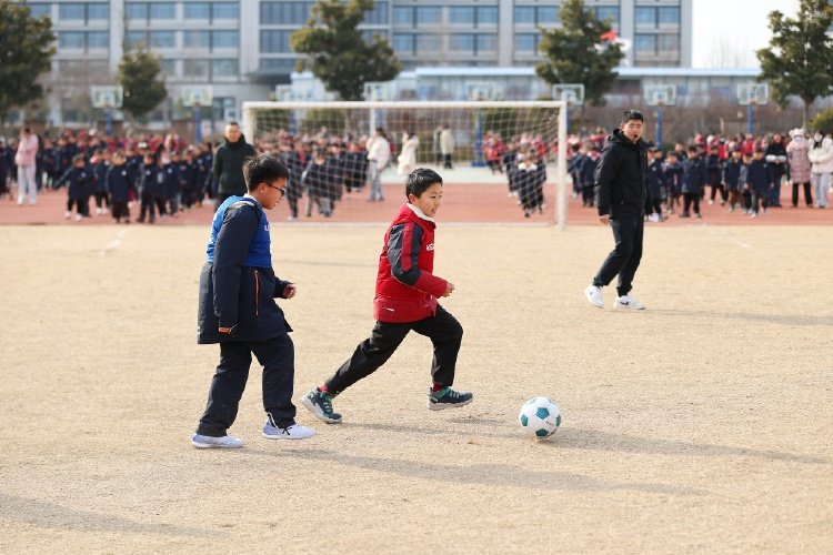2025年2月20日,江苏省淮安市洪泽城南实验小学,学生在大课间活动中踢足球。 视觉中国 图