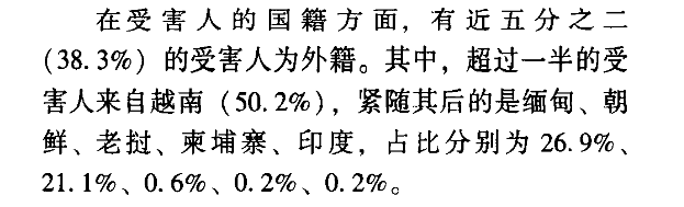 2019年,一篇载于《中国公安大学学报》的论文《我国拐卖妇女犯罪特点及治理策略——基于1038份裁判文书的分析》指出,在文章统计的1662名受害者中,近40%为外籍,主要是越南籍。