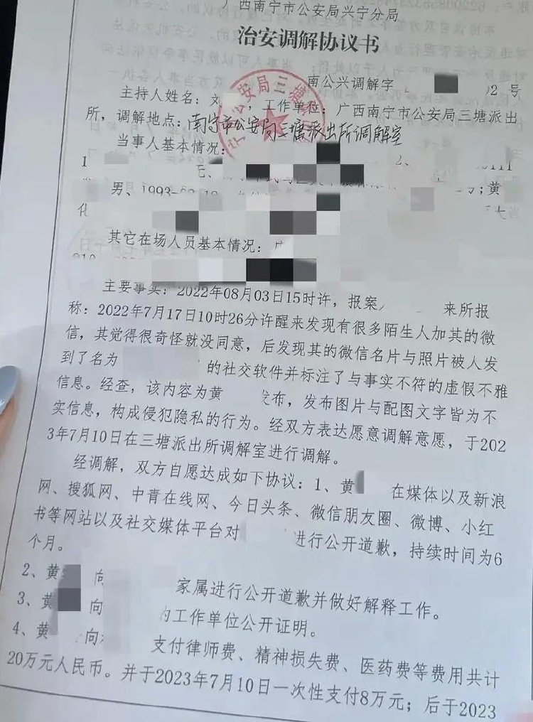 在警方出示的完整证据面前,黄某承认了网络造谣行为,并签署调解书承诺公开道歉及赔偿刘晓玲20万元。刘晓玲表示,她曾追问过,黄某如何得到她的照片和电话,但没有得到回应。此外,由于调解后黄某拒不履行义务,2023年7月12日,南宁兴宁公安分局依法对其作出处罚:行政拘留10日并处罚款500元。